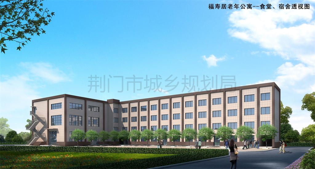 荆门福寿居置业有限公司申报的福寿居位于天鹅路9号,原规划及建筑方案于2014年3月经市规委会审批,为了能给入住老人提供更好的餐饮服务,促进福寿居养老事业的健康发展,特申请新建食堂及员工宿舍,建筑面积约2800平方米。