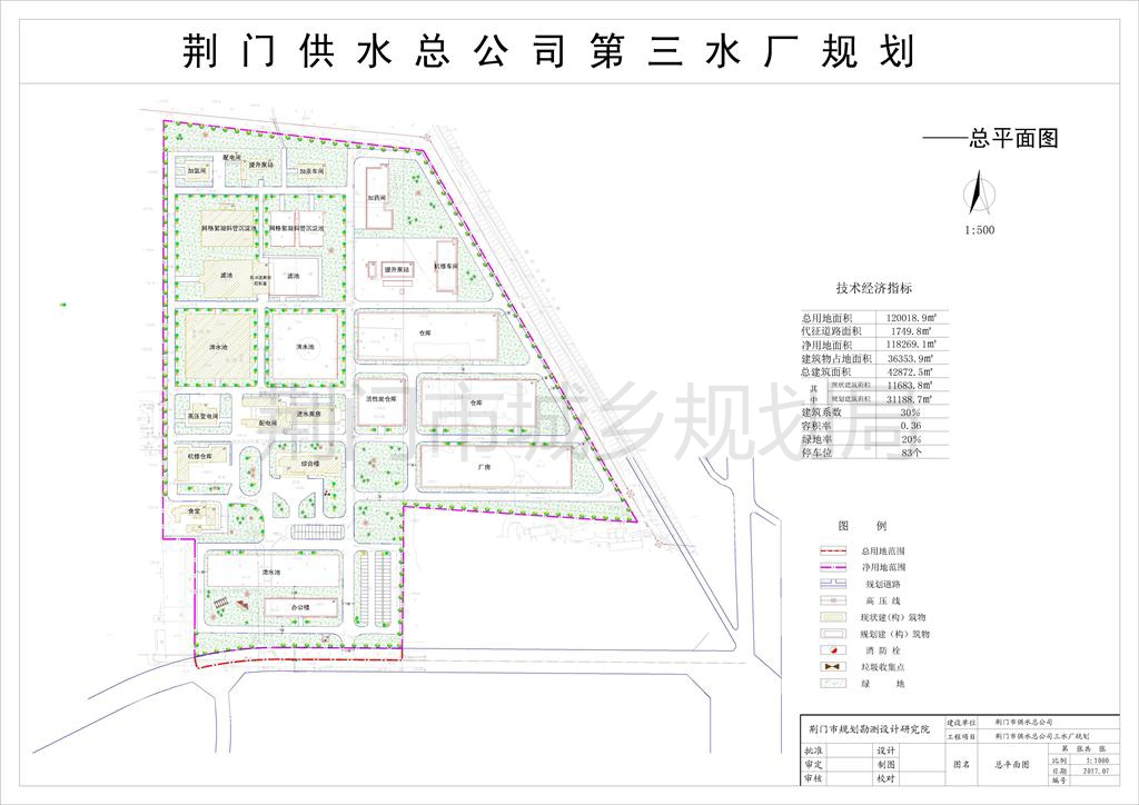 荆门市供水总公司申报的荆门供水总公司第三水厂扩容提质项目位于总干渠以南、白云大道以西、武警支队以北。项目扩建后,规划净用地面积118269.1平方米,总建筑面积42872.5平方米(其中现状建筑11683.8平方米,规划建筑31188.7平方米),建筑密度30%。