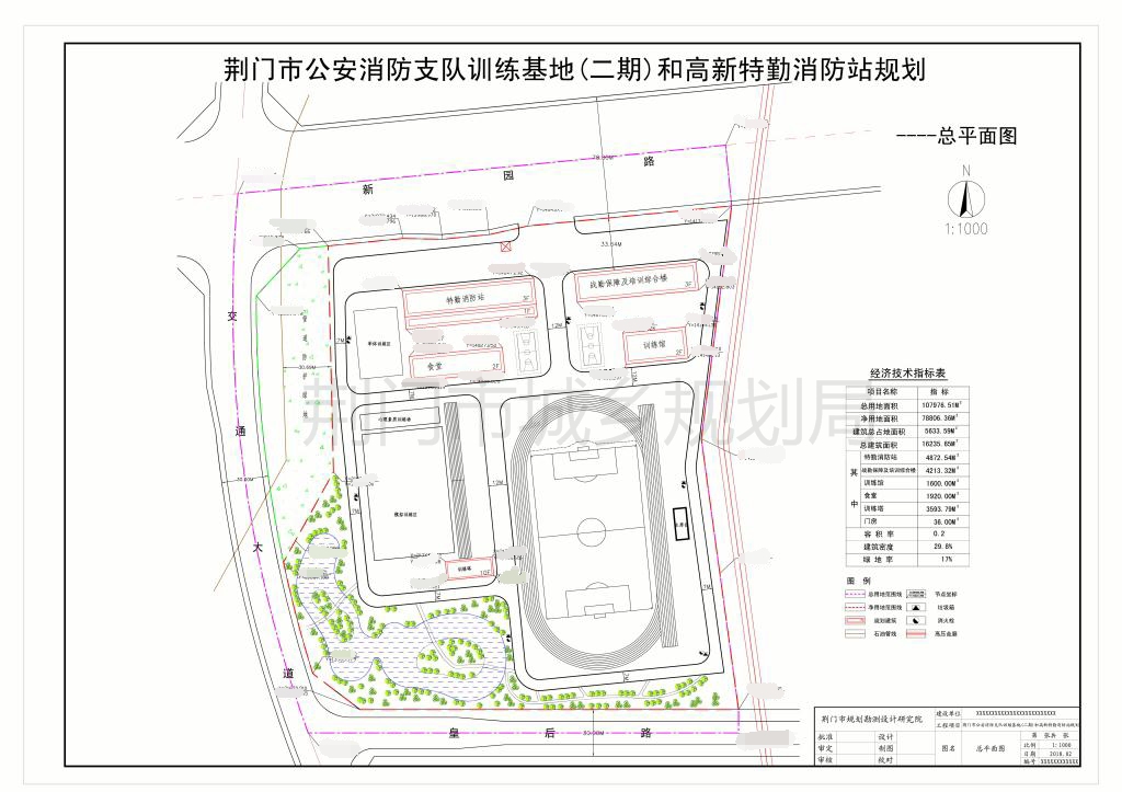 荆门市公安消防支队申报的消防训练基地和高新消防站位于新园路以南、皇后路以北、交通大道以东。规划净用地面积78806.36平方米,总建筑面积16235.65平方米,容积率0.2。