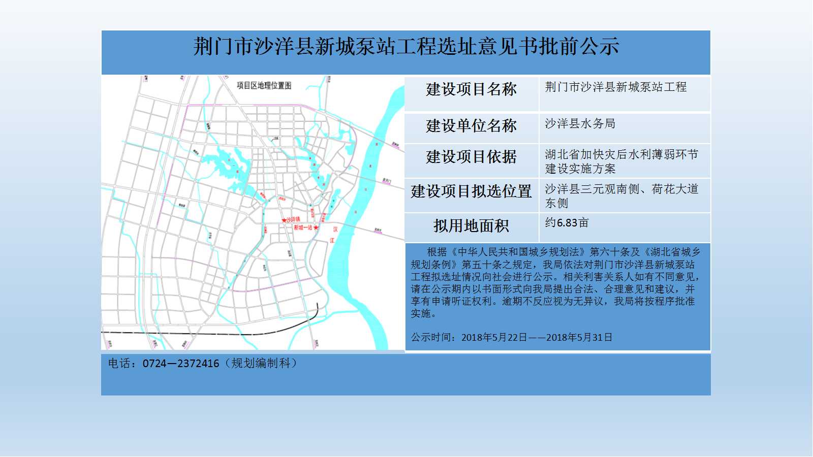 沙洋县新城泵站工程建设项目选址意见书批前公示